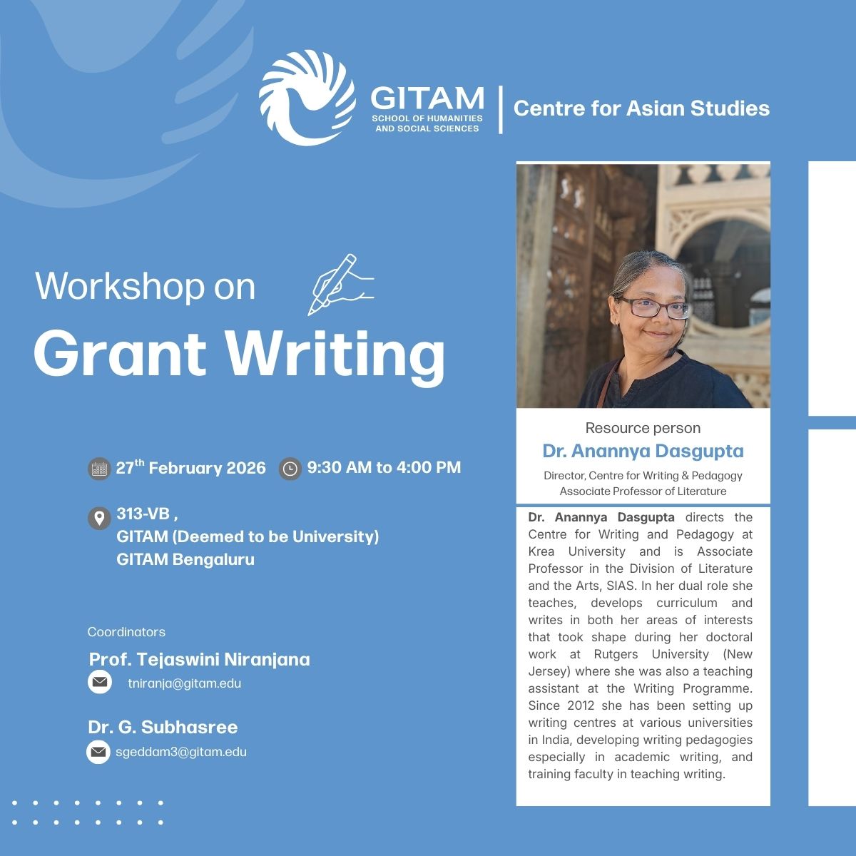 Dr Anannya Dasgupta, Director, Centre for Writing & Pedagogy (Krea-CWP) and Associate Professor, Literature, SIAS, conducted a grant writing workshop for the Social Sciences and Humanities at GITAM University, Bengaluru on 27 February 2026. This workshop is being hosted by the Centre for Asian Studies for its faculty members.