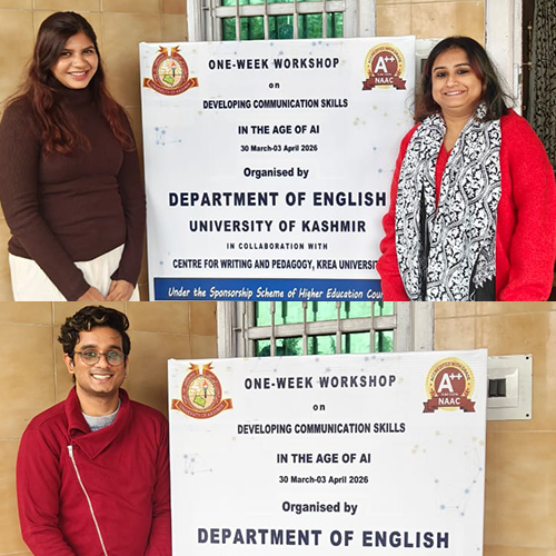 Krea-CWP faculty members, Meghna Bohidar, Faculty Teaching Associate; Neha Mishra, Assistant Professor of Practice; and Sayantan Datta, Assistant Professor of Practice were invited by the Department of English, University of Kashmir, to conduct a week-long reading-writing workshop for their MA students and PhD scholars. The workshop titled ‘Developing Communication Skills in the Age of AI’ was held from 30 March to 3 April 2026.